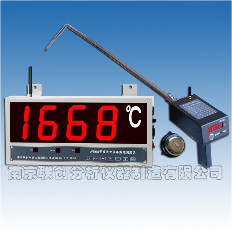 W660无线式大屏幕熔炼测温仪将手提式测温仪测得的温度值通过无线传输技术同步准确传输到壁挂式大屏幕显示器,省却了壁挂式大屏幕测温仪连线的麻烦,更提高了仪器的抗千扰能力。仪器与相适应的热电偶配套可在多种场合进行精密快速测温